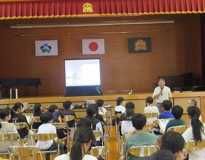 【6年生】74歳でネパールのメラ・ピークの登頂に成功された高崎町在住の東さんから、お話を聞きました。登山の映像や、実際に使われた道具類を見ながら迫力あるお話に引き込まれました。
