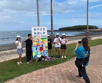 渚の交番に到着。砂浜を歩いたり、青島神社を散策したりしています。