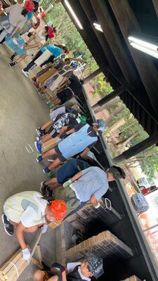 青島は小雨のため、午前の活動が室内オリンピックに変更になりました。活動班で様々な種目に挑戦していきます。ストラックアウト、カーリング、ディスクゴール、キャッチザスティック、けん玉などの種目があるそうです。班のみんなで協力して挑戦しています。