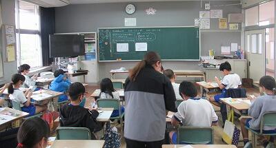 【4年生】教室の後ろまでいっぱいの多人数の4年生ですが、集中して学習に取り組んでいます。算数の時には、2教室に分かれるので、少人数で勉強しています。