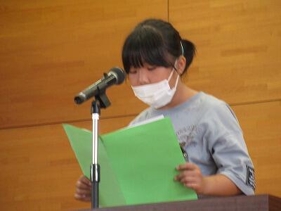 写真は終業式で「1学期を振り返って」という題名で作文を読んでいる様子です。3年生と5年生が読んでくれました。勉強でがんばったことや、高学年としてがんばったこと、これからさらにがんばりたいことを上手な読み方で発表してくれました。