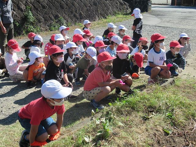 まず3年1組では、地域の方々に昔の様子について説明していただきました。遠足のときには、まさしく遠くまで歩いていくもので、東霧島神社まで行っていたことなど、子供たちからは「えーっ」という驚きの連続でした。子供たちは、「昔の方がいいなあ」「今の方がいいなあ」など、今の自分たちの学校生活と比較して意見を出していました。