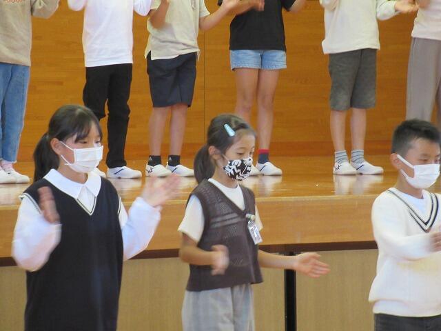 本校だけ演目を2つさせていただきました。最初のボディーパーカッション「千本桜」です。3列に並んだ子供たちが列ごとに違うリズムで演奏します。緊張の中でもしっかりリズムを刻んでいました。さすがです。