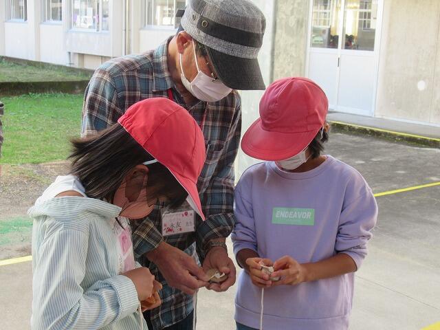 3年生の総合的な学習の時間では、高崎の昔と今について調べ、ふるさとの良さを知り、ふるさとを大切に想う心を育んでいます。その学習の一つとして、地域の方々に高崎の昔の様子について話を聞く時間と、地域の方々が子供の頃にしていた遊びを体験する時間があります。今日は、その様子をお伝えします。