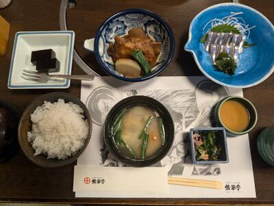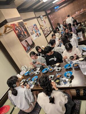 お待ちかねの昼食です。みんなお腹ペコペコのようです。正調さつま料理熊襲亭で、鹿児島の郷土料理の昼食です。きびなご、とんこつ、さつま汁・・・美味しくいただいています。