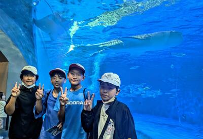 1日目の最後の訪問地「かごしま水族館」です。毎年、子供たちが楽しみにしている見学地の一つです。大水槽に泳ぐジンベイザメやイルカショーに感動していました。たくさんの魚に囲まれながら、子供たちの目がキラキラ輝いています。