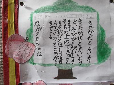 1年生です。読んだ本の紹介をしています。りんごは、友達の紹介文についてメッセージを書いて貼っています。