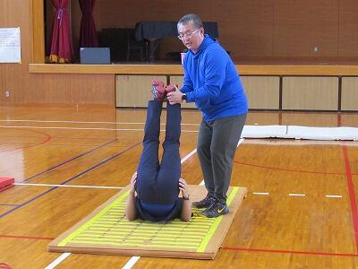 前転(前回り)のポイントとなる動きを説明しています。足の長いお手本の先生は本校の先生です。