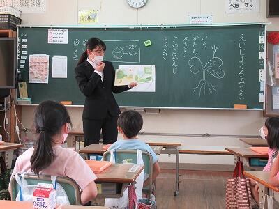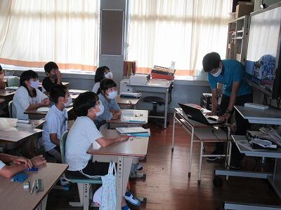 体験に来ているのは大学3年生の「えいじま くるみ」さんです。本校の卒業生です。県教育委員会のスクールトライアル事業の一環として体験に来られています。この事業は、教職を目指す大学生が教員の日常の職務内容を体験することを目的としています。
