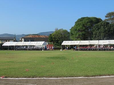 開会式の始まる前の様子です。少し芝生が湿っていたため、体育座りではありません。