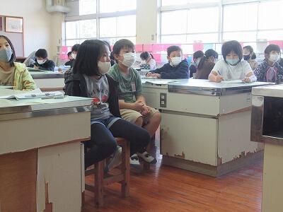 真剣に聞いている子供たちです。メモを一生懸命にとる子供もたくさんいます。「豚肉や牛肉を食べることはなく、たまに鶏肉を食べるぐらいで、にわとりを自分の家でさばいて食べていた」という話に、子供たちから一斉に「えーっ」と驚きの声が!昔の遊びのほとんどが、自分たちで考えたり、道具を作ったりしていたことや、洗濯板で選択していたことなど、子供たちにとっては驚きの連続だったようです。