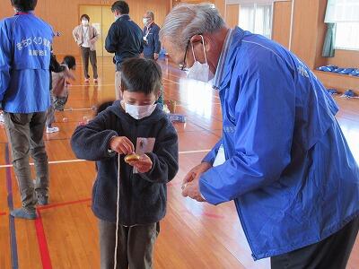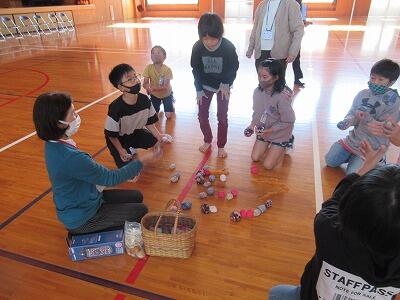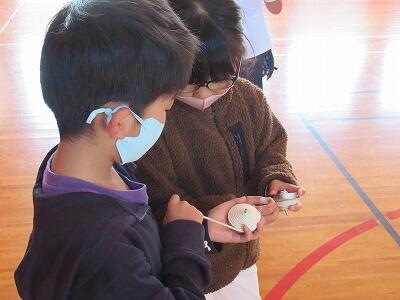 コマ回しです。まずは紐を巻くのが難しいんですよね。子供たちも四苦八苦しておりました。