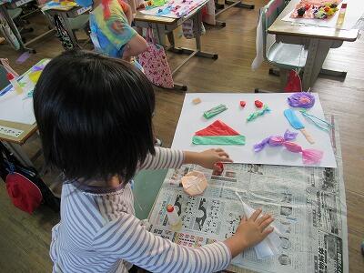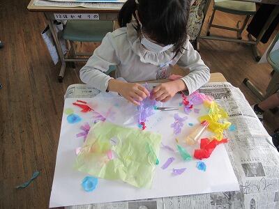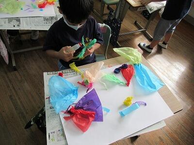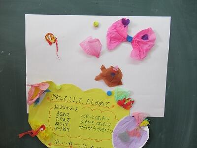 「さわって たしかめて」という学習で 紙花等に使う柔らかくて薄い紙を丸めたり、ちぎったり、自分なりに工夫して形作りをしていました。