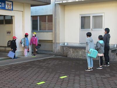 児童靴箱前で左が先に登校した班、右がそのあとに登校した班が向かい合ってあいさつをします。一日の始まりに友達の顔を見て元気よくあいさつすると、何だか「いい一日になりそうだなあ」と気分が高揚しますよね。