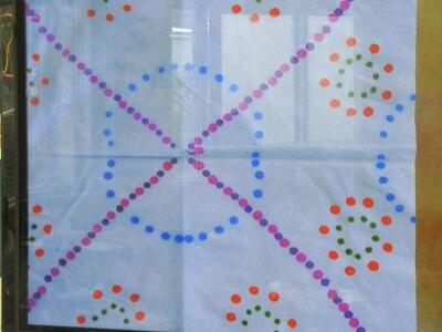 青色を使って、てんてんてん・・・・・とデザインしています。完成はどうなるでしょう?この先どうなるのか気になるなあ・・・・