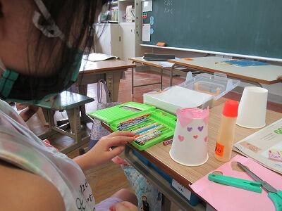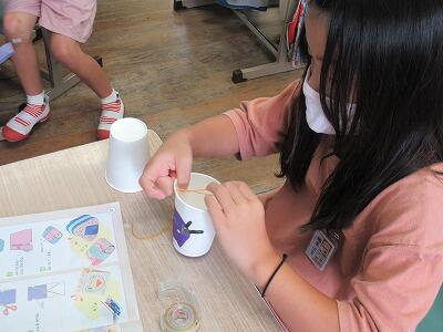 紙コップが、かわいいキャラクターに変身していますね。ハートを基調にした何とも言えない愛らしさが伝わってきます。もう一つは真っ白だけど、どうして2つ使うのかなあ・・・・・