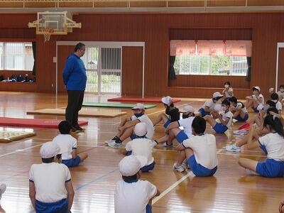 昨日、6年生の体育にビッグなゲストをお招きました。小林高校の内之倉先生です。これは体育振興指導教員派遣という県の事業の一つで、より専門性の高い指導により体育学習の充実を図るというものです。今回はマット運動の前転(前回り)や後転(後ろ回り)の指導をしていただきました。