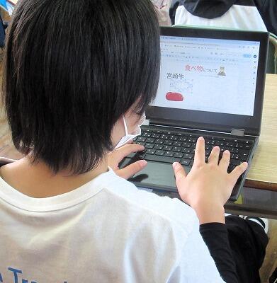 【4年生】食べ物や文化、自然など様々な面から、自分が発見した「宮崎県の魅力」が伝わるように工夫して作成していました。4年生でもイラストや画像、アニメーションを使って、一人でどんどん作成しています。