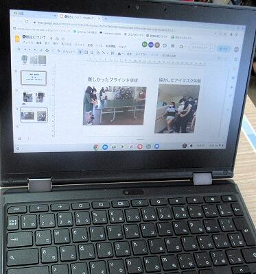 【5年生】総合的な学習の時間で調べてきた「福祉」について、プレゼンを作成中です。アンケート結果や、実際にアイマスク、ブラインド卓球など体験したことを入れながら、人々が暮らしやすい町づくりについて考えていました。