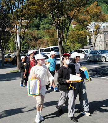昼食の後は、「班別自主研修」。照国神社をスタートし、黎明館ゴールです。その間、西郷隆盛像、県立博物館、メルヘン館、市立美術館、西南戦争の銃弾跡などのチェックポイントをグループごとに巡ります。子供たちの表情がとても生き生きしています!