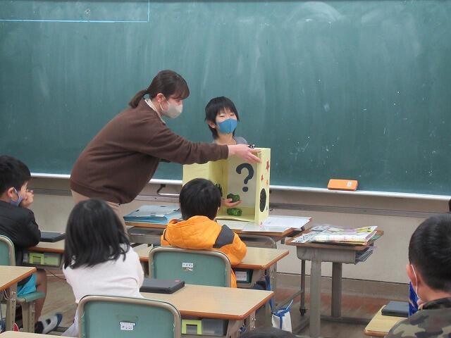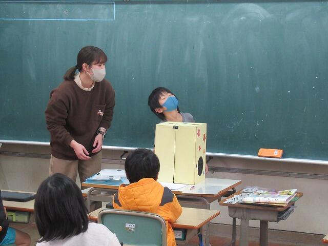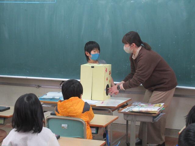1年生が先生の持っている箱に注目していますね。何でしょう?