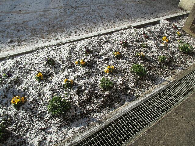 そして、そして、運動場は・・・というと、一面、真っ白になっていました。花壇も真っ白です。