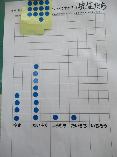 先生たちにも投票用紙が配られました。飼育委員会の子供たちが候補として挙げている名前でよいなあと思うものにシールを貼るそうです。先生たちの意見としては「だいふく」が多いようです。