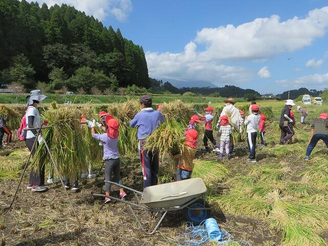 地域の「ふもとっ子を伸ばす会」や保護者の方に教えていただきながら、一人一人鎌で刈り取り、掛け干しも体験しました。