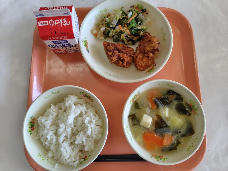 ごはん しあわせ上々鶏のから揚げ 県産野菜のおかか和え わかめのみそ汁 牛乳