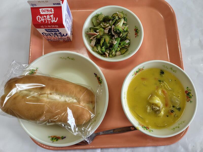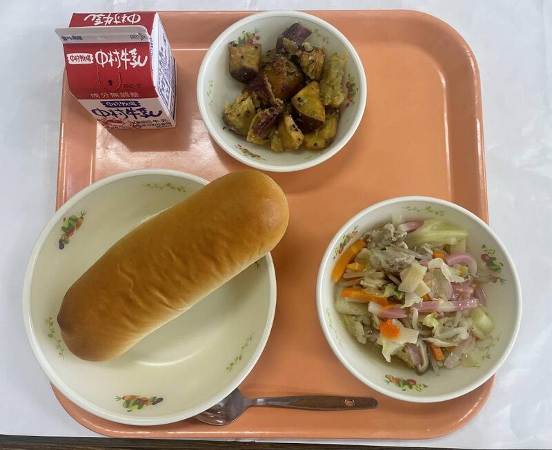 ミルクパン 春雨スープ 鶏肉とさつまいものオーロラ和え 牛乳