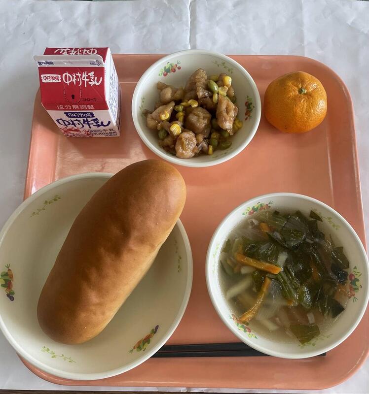 黒糖パン 鶏肉のレモン和え チンゲンサイのスープ みかん 牛乳