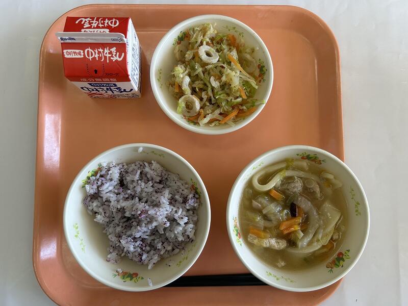 減量赤かぶ青菜ごはん 五目うどん キャベツの梅肉和え 牛乳