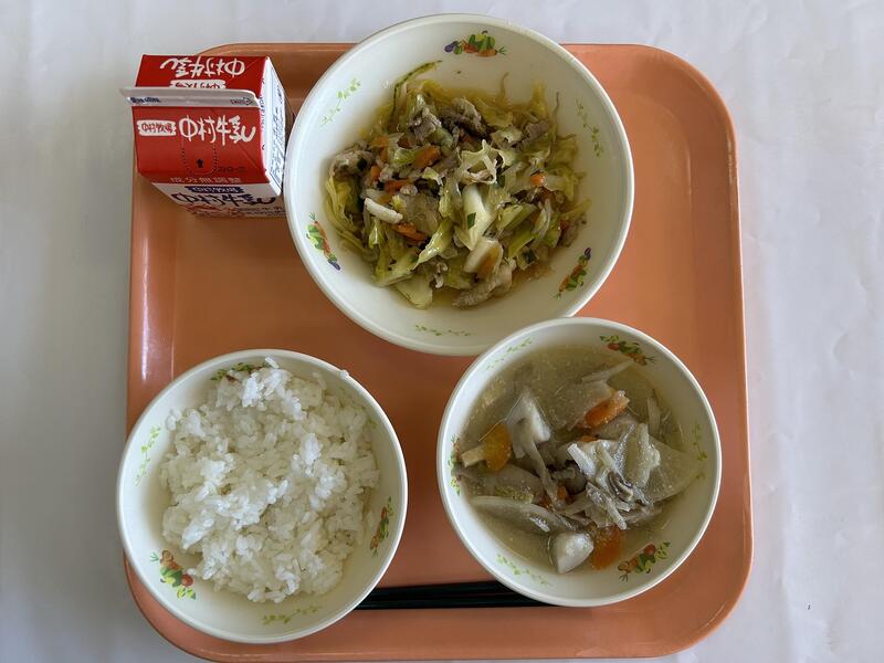 ごはん 豚肉と野菜のしょうが炒め ごぼう団子汁 牛乳