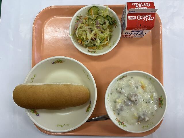 米粉パン クリームシチュー グリーンサラダ 牛乳