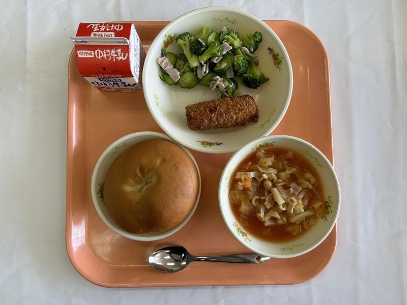 コッペパン かぼちゃのポタージュ スパゲティサラダ マーシャルビーンズ 牛乳