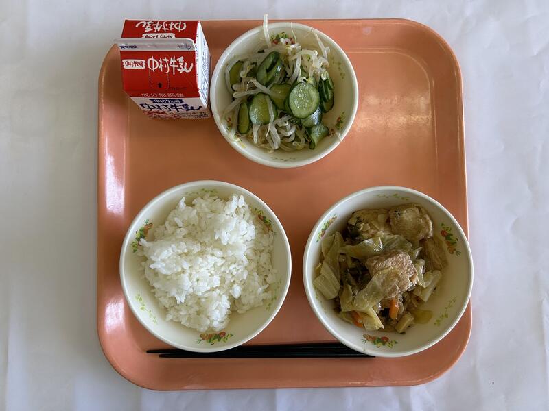 ご飯 厚揚げの中華煮 もやしのごま酢和え 牛乳