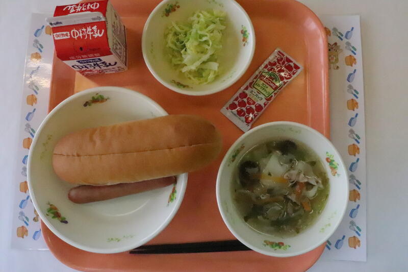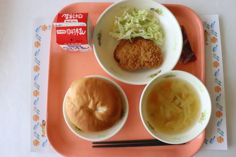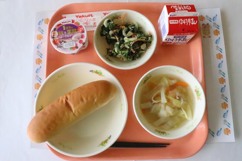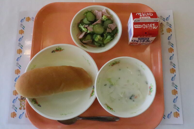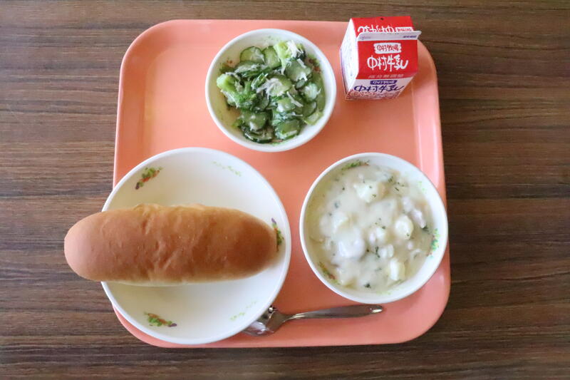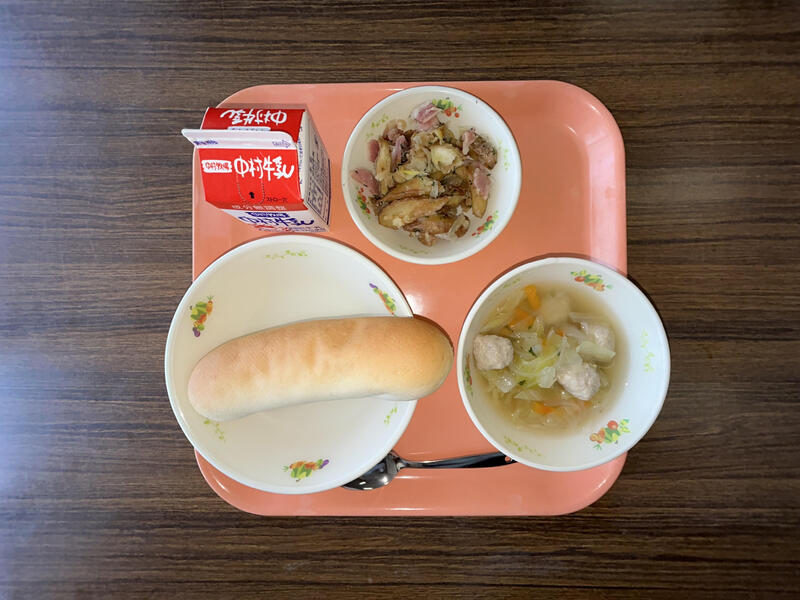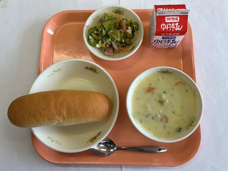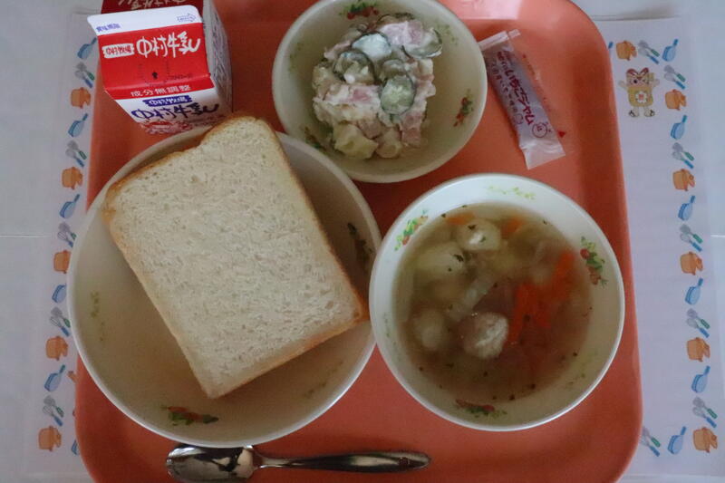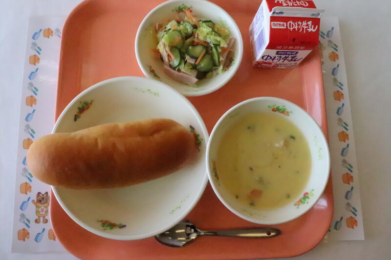 ミルクパン、ジャーマンポテト、ミネストローネ、牛乳