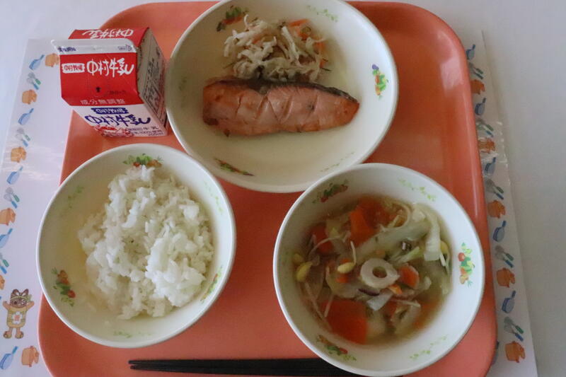 ごはん、鮭ぱっぱ、うま煮、海藻サラダ、牛乳