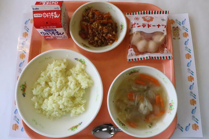 カレーごはん、ドライカレー、マロニーのスープ、ポンデドーナツ、牛乳