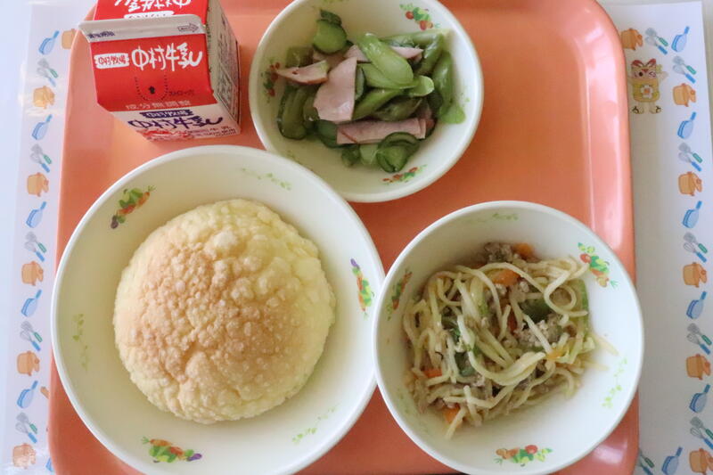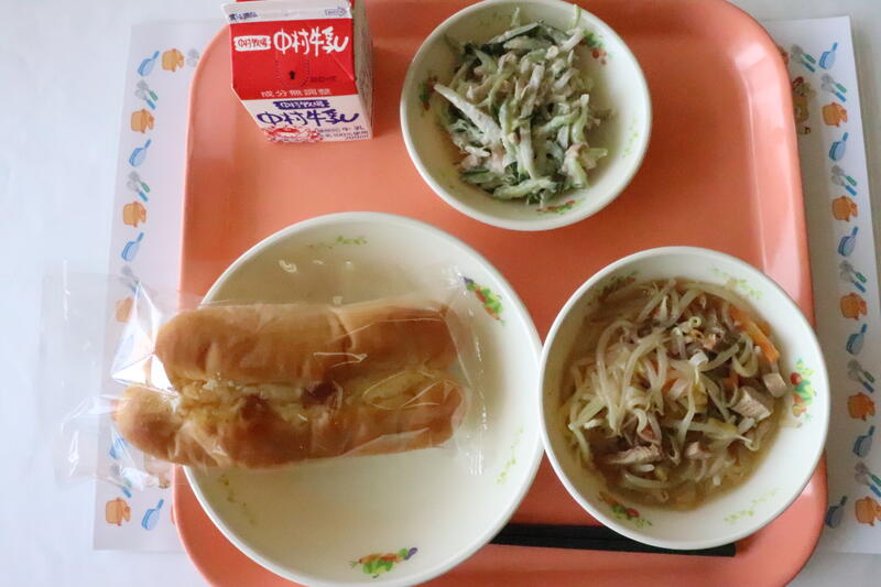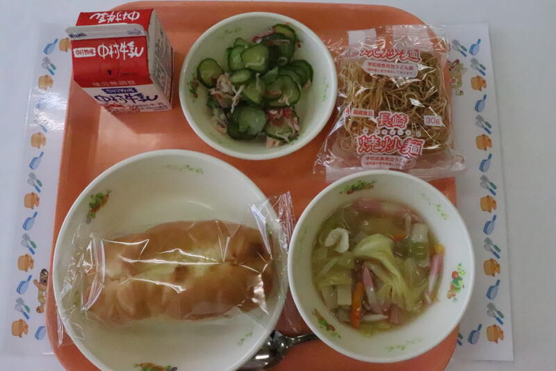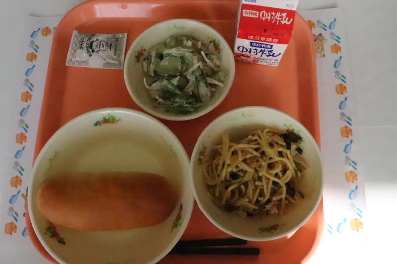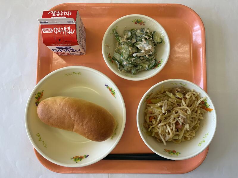 減量マヨネーズパン、皿うどん、きゅうりの中華漬け、牛乳