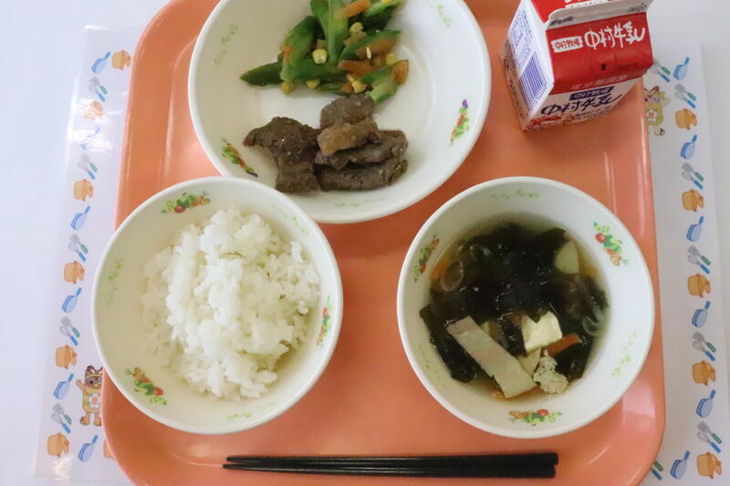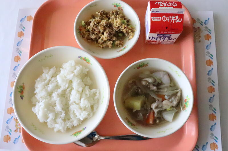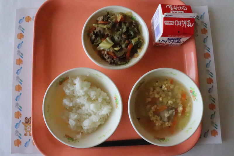 ごはん、いわしの梅みそ煮、ゆかり和え、かきたま汁、牛乳