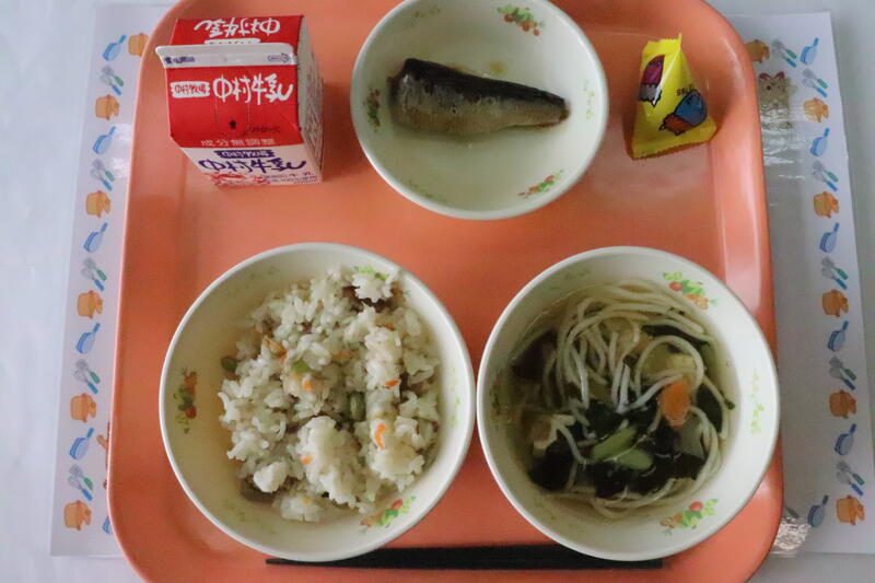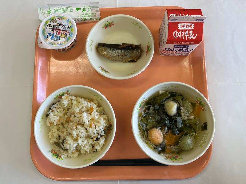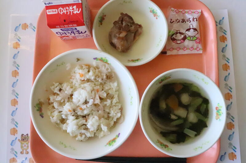 山菜炊き込みご飯 いわしの梅煮 つみれ汁 子どもの日デザート