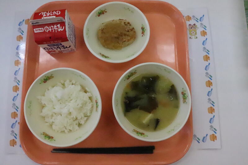 ごはん、おろし豆腐ハンバーグ、カボチャの味噌汁、牛乳