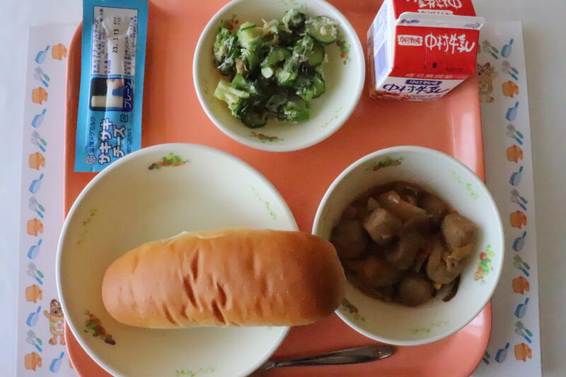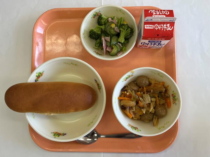 米粉パン、豚肉のトマト煮、カルシウムたっぷりサラダ、牛乳