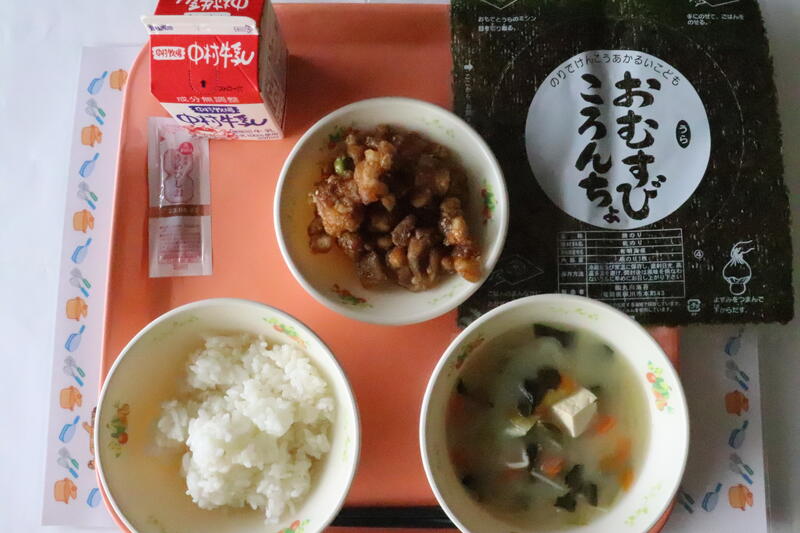 ごはん、梅びしお、おむすび用のり、鶏肉と大豆の甘辛上げ、豆腐の味噌汁、牛乳