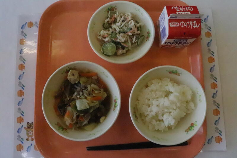 ごはん、厚揚げの中華煮、いかときゅうりの中華和え、牛乳