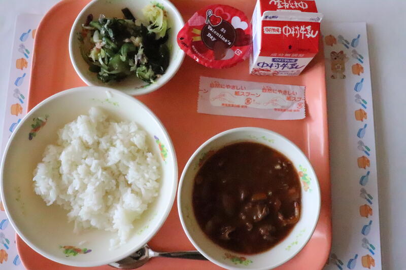 ハヤシライス、海藻サラダ、バレンタインデザート、牛乳