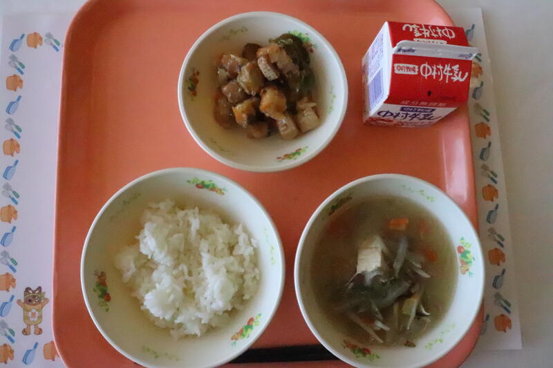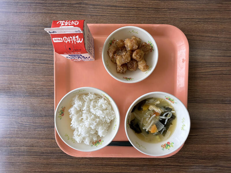 ごはん、県産ぶりの甘から揚げ、みぞれ汁、牛乳