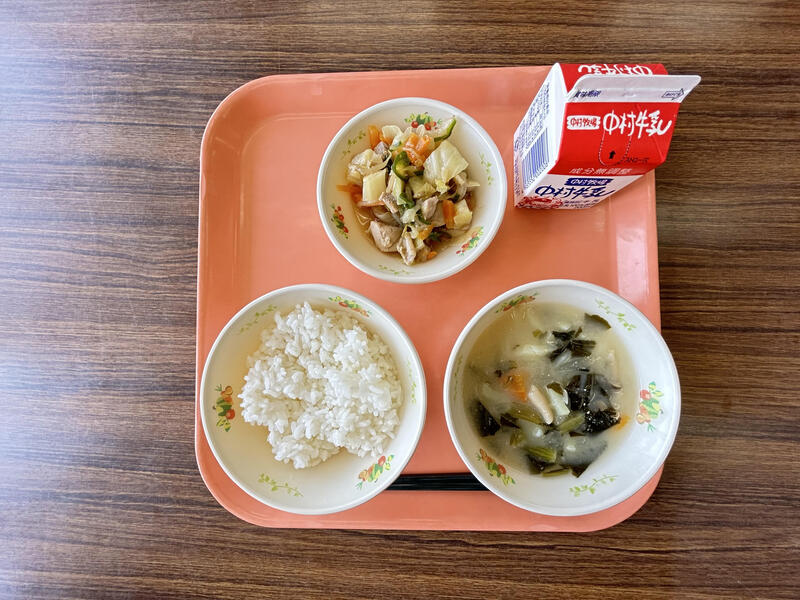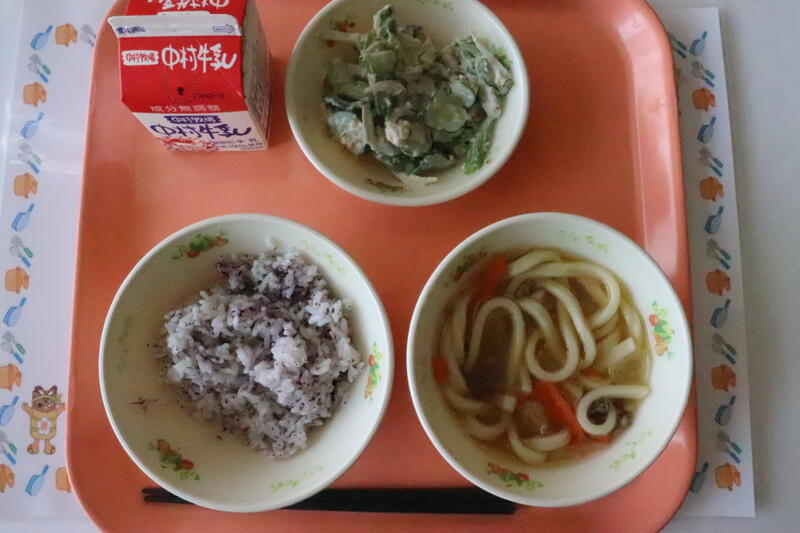 減量赤かぶ青菜飯、かしわうどん、もやしのゴマ酢和え、牛乳