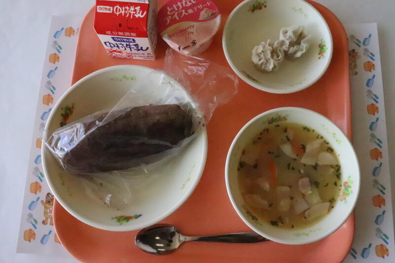 コッペパン、日向夏みかんジャム、魚のたこ焼きソース絡め、プチ餃子スープ、牛乳